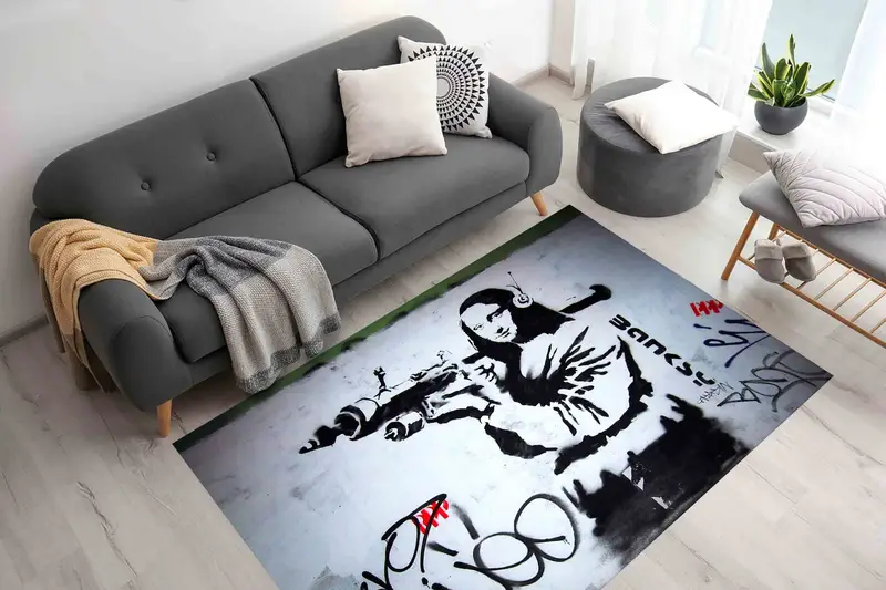 Banksy Inspired Art Print Rug, Modern Graffiti Home Decor
