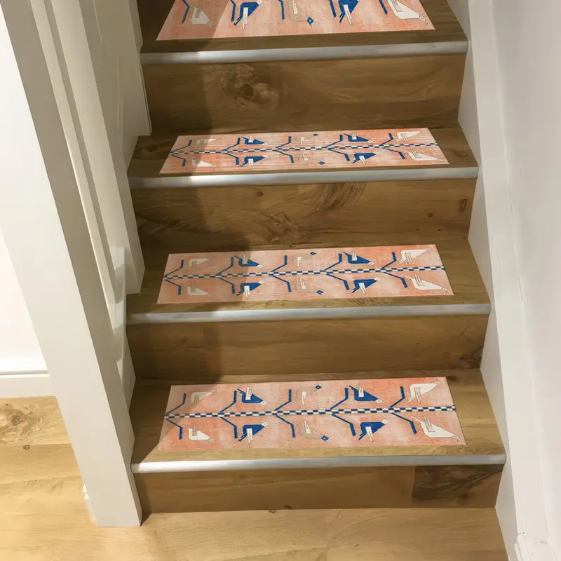 Beige White Birds Printed Rug - Boho Step Rug with Kilim Design