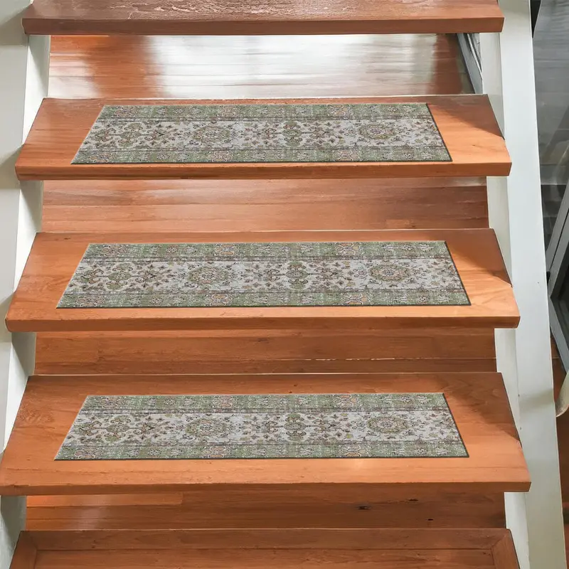 Green Floral Kilim Printed Rug, Aztec Navajo Boho Design Step Rug