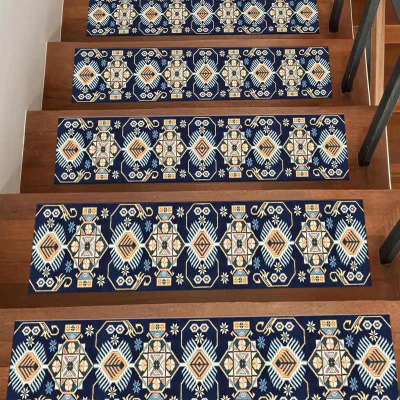 Blue & Beige Geometric Vintage Printed Rug - Step Rug