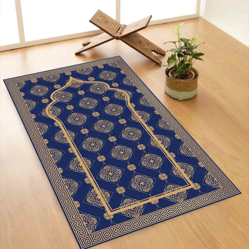 Navy Blue & Gold Prayer Rug: Printed, Spiritual, Elegant Design