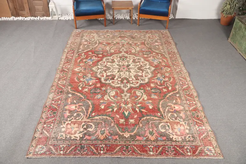 6.6x9.7 ft Rug, Turkish Vintage Rug, Red Rainbow Geometric with floral elements Rug