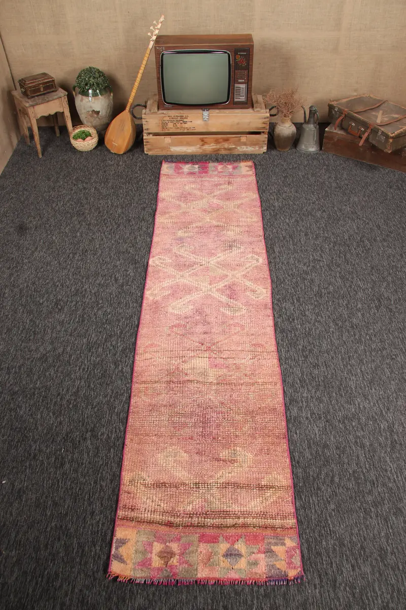 Vintage Herki Small Rug 2.3x9.9 ft (70x302 cm), Turkish Pink Geometric Rug