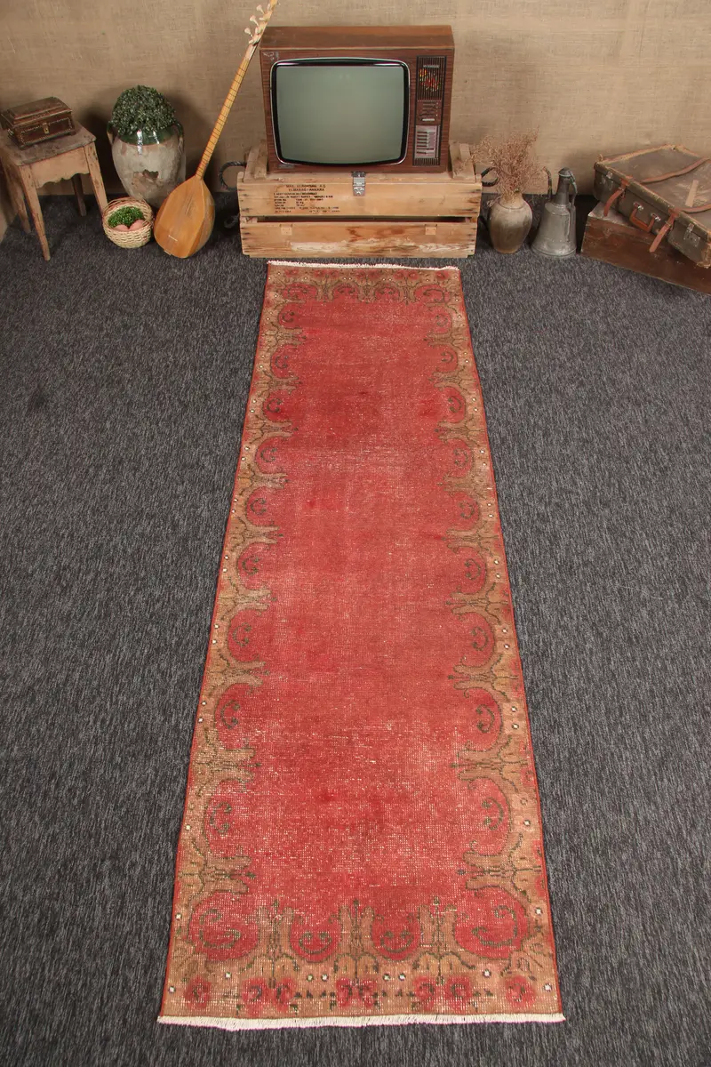 Rug Vintage Rug, 2.7x9.1 ft Turkish Rug, Red Geometric Rug