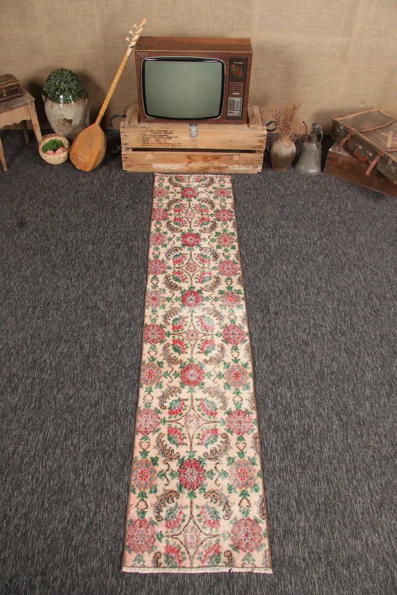 Vintage Small Rug, 1.8x8.1 ft Turkish Rug, Green Geometric with floral elements Rug