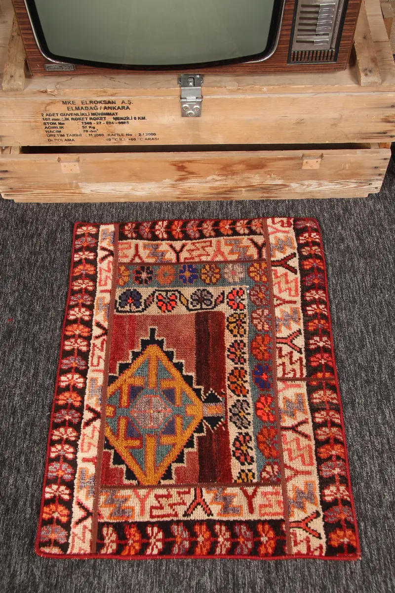 2x2.8 ft Patchwork Rug, Turkish Vintage Rug, Red Brown Geometric with floral elements Rug