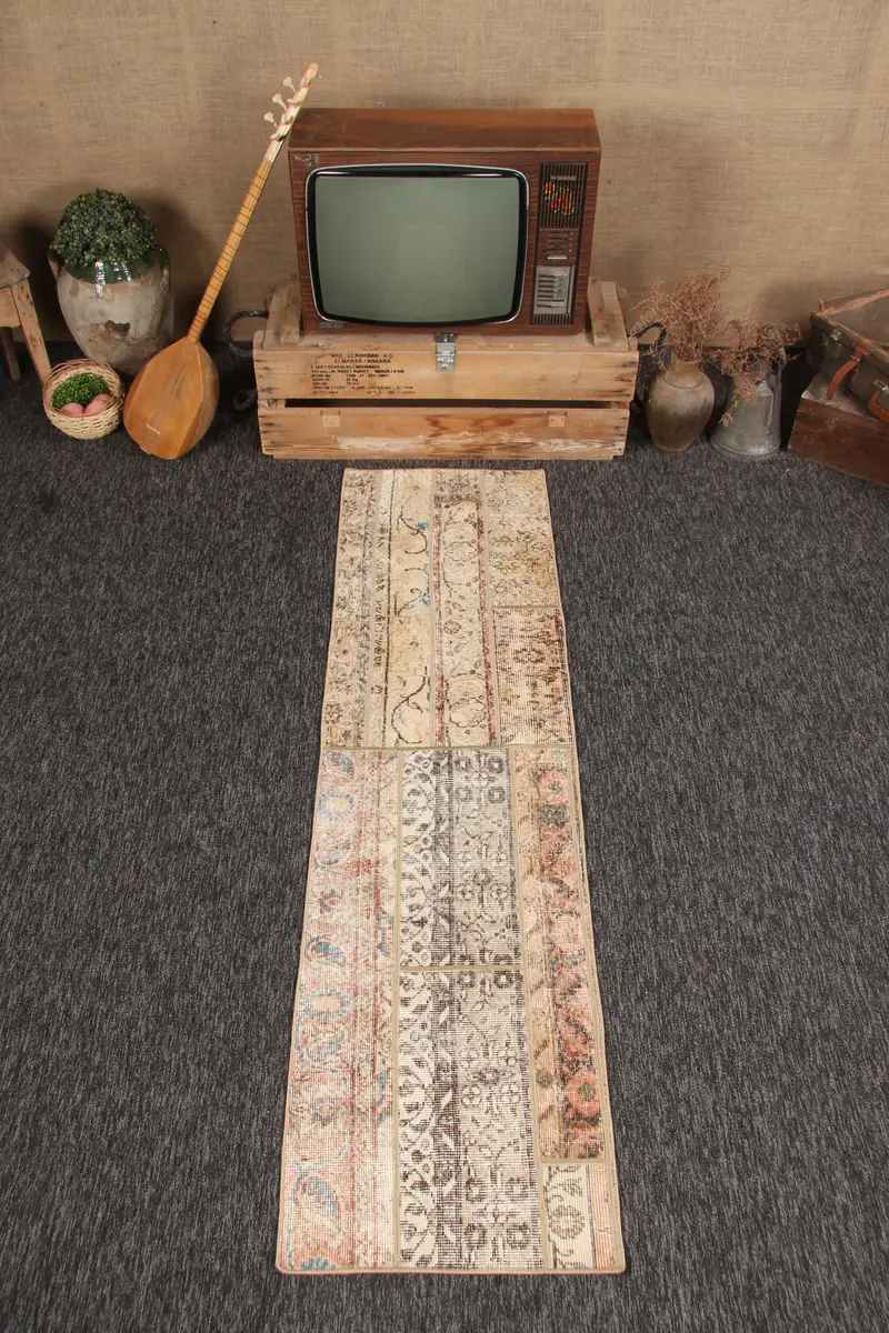 1.8x6.6 ft Rug, Vintage Turkish Rug, Patchwork Beige Geometric with floral elements Rug