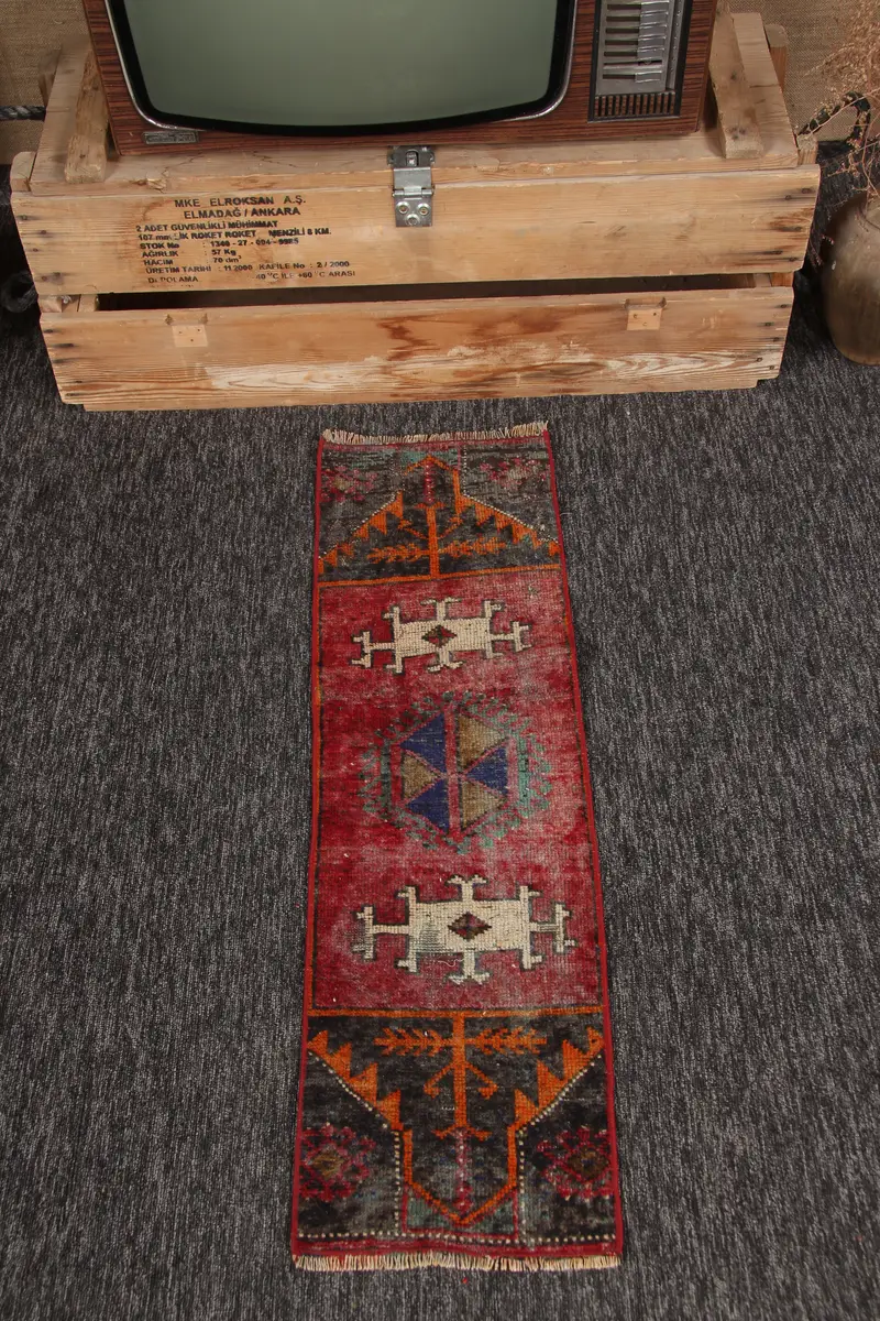1x3.5 ft Small Turkish Rug, Vintage Rug, Red Rainbow Geometric Rug
