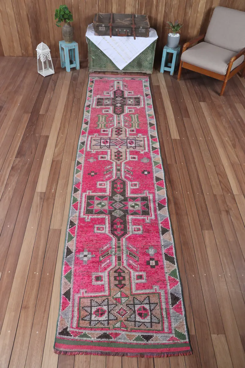 2.6x11.5 ft Vintage Turkish Rug, Small Rug, Pink Herki Geometric Rug