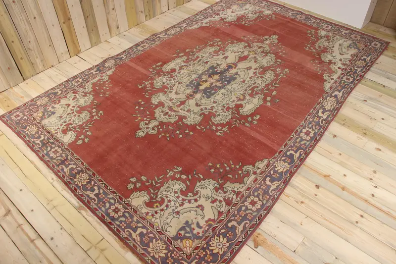 8x12.2 ft Rug, Turkish Vintage Rug, Red Blue Patchwork Wool Rug