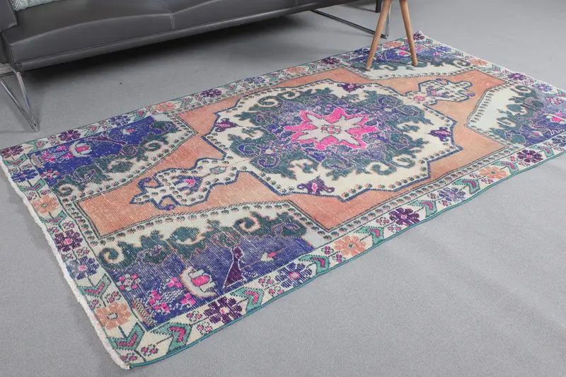 4.1x7.5 ft Vintage Turkish Rug, Area Rug, Blue Orange Bordered Wool Rug