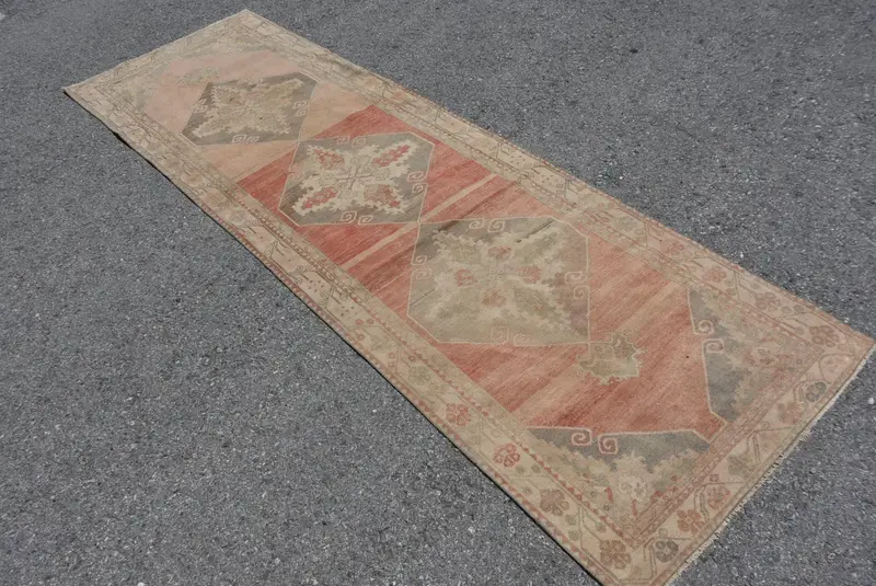 Turkish 3.1x10.4 ft Rug, Vintage Rug, Red Floral Rug Wool