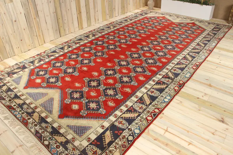 Vintage Turkish Oversize Rug 8.7x17 ft, Red Check Rug Wool