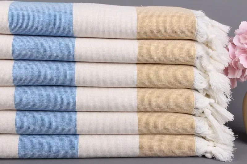 Organic Beach Towel, Turkish Cotton Mustard-Cream-Blue Stripes, 36x71 Inches