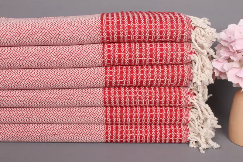 Personalized Beach Towel, Red & Beige Striped Organic Cotton, 36x69 Inches