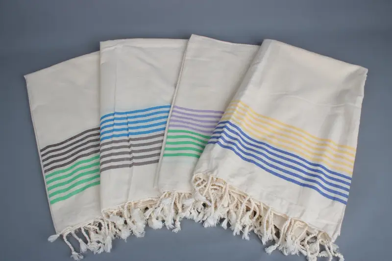 Beach Towel Embroidered Organic Cotton Beige Stripes, 40x71 Inches