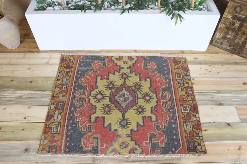 Vintage Turkish Rug, 3.7x3 ft Rug Rug, Red Yellow Geometric Rug