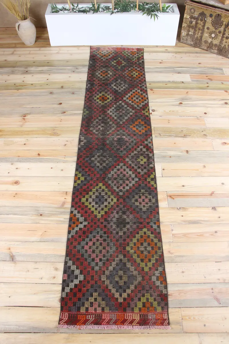 2.2x10.2 ft Runner Vintage Rug, Turkish Rug, Red Rainbow Geometric Wool Rug