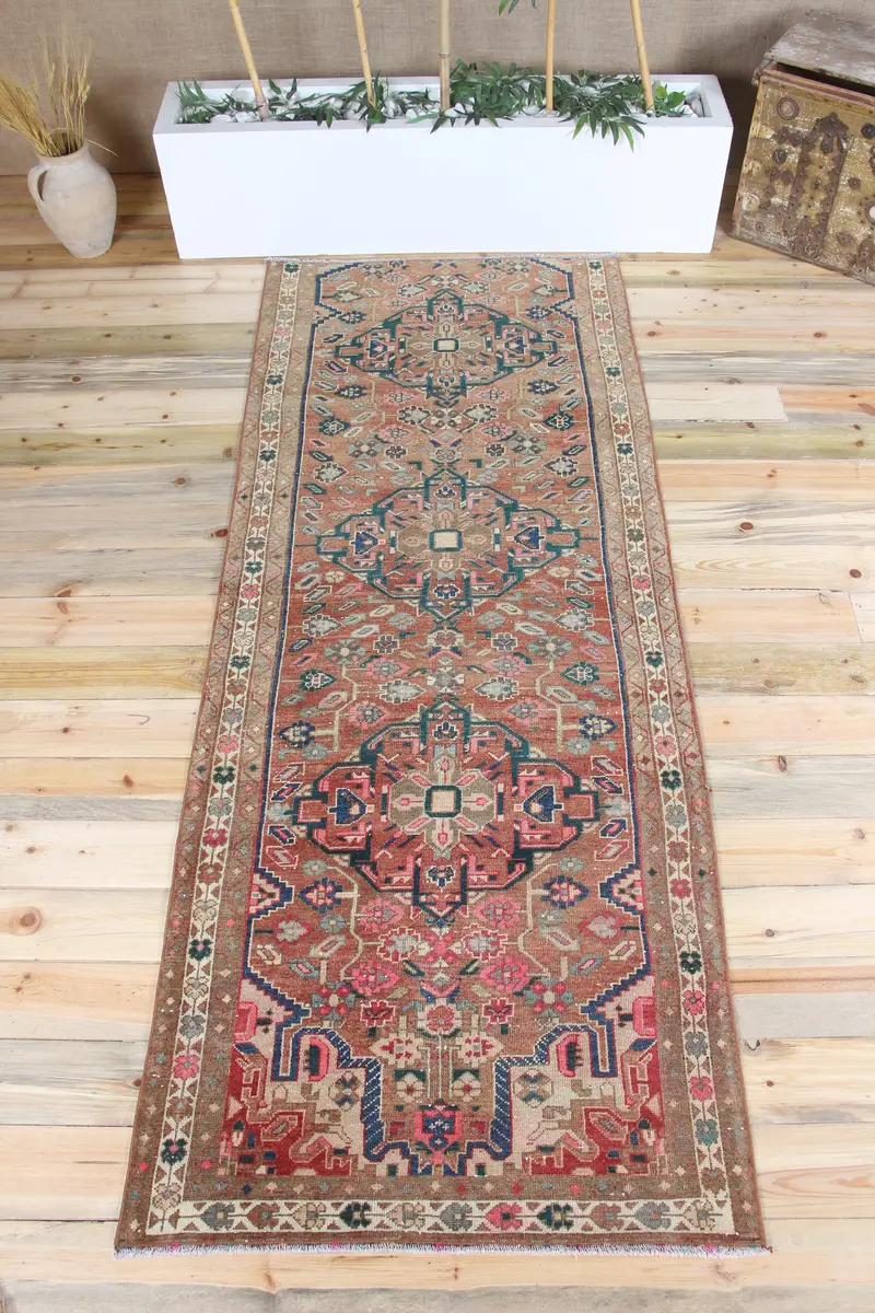 Vintage Turkish Rug, 3.3x8.6 ft Runner Rug, Brown Pink Floral Rug