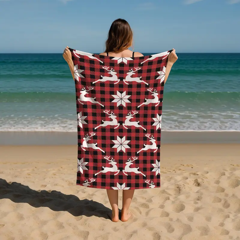 Holiday Beach Bath Towel Red Plaid Reindeer Printed, 28x53 Inches