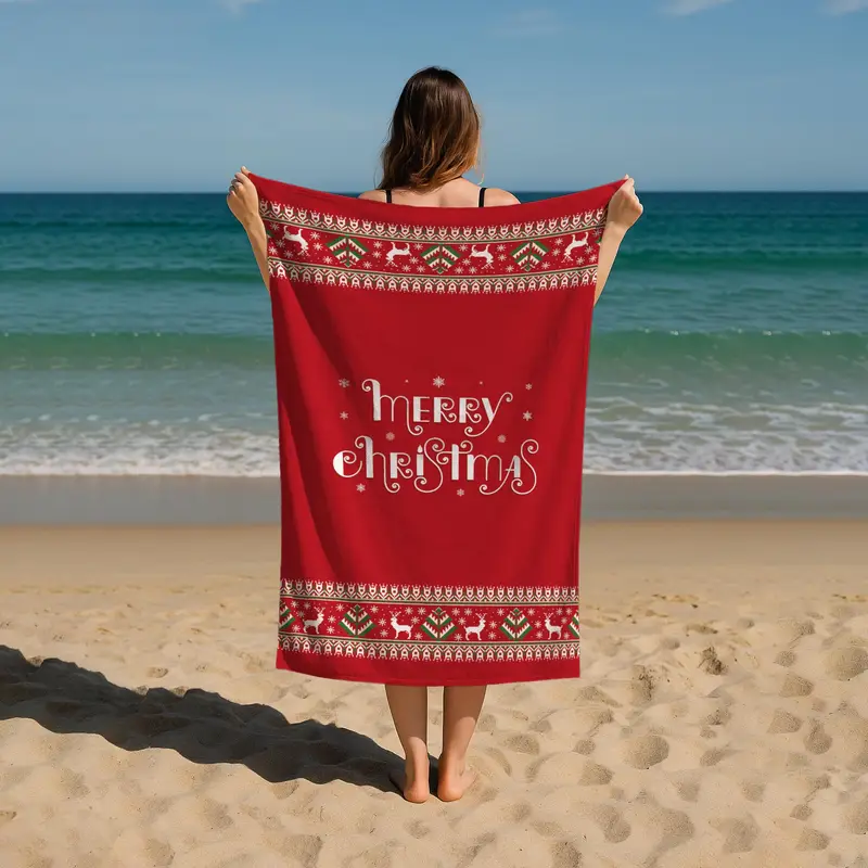 Red Merry Christmas Printed Beach Towel, Festive Pattern, 28x53 Inches