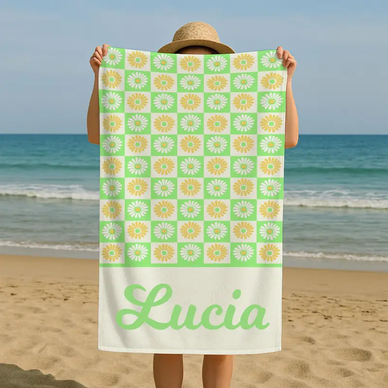 Personalized Retro Flower Beach Towel Custom Name Daisy Print, 28x53 Inches