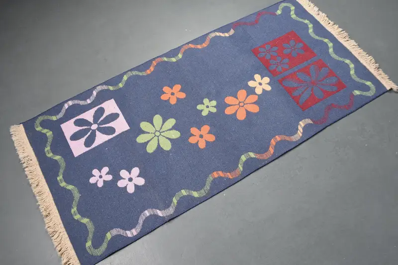Vintage Turkish Rug, 2.5x5.3 ft Rug, Blue Red Solid Wool Rug