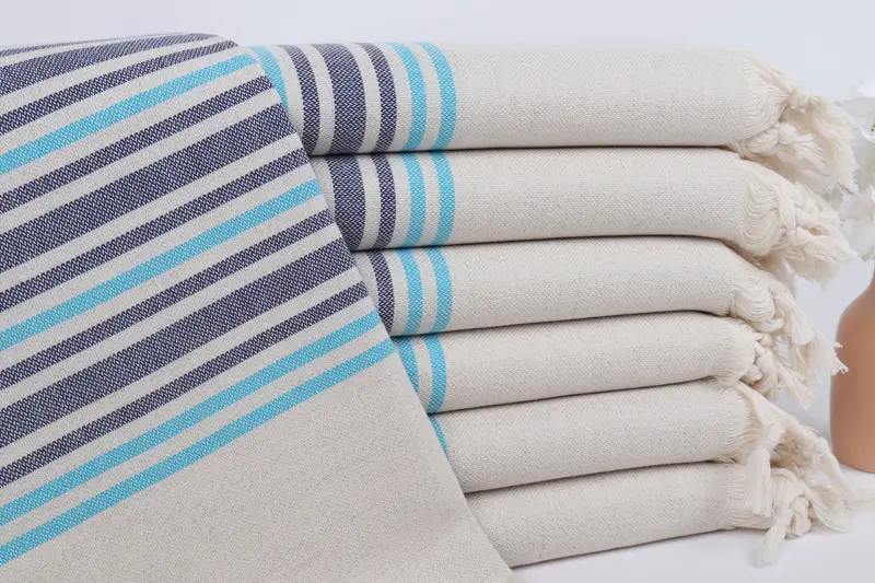 Beach Towel Turquoise-Navy Blue Striped Linen Towel, 36x71 Inches
