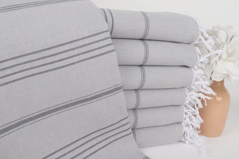 These bulk towels are characterized by their 100% organic Turkish cotton composition, ensuring superior absorbency and quick drying properties. Each towel measures 40x71 inches or 100x180 cm, weighing 265 grams, providing versatility for various uses including beach, bath, and travel. Hand-woven with a tolerance of ±2.5%, these towels maintain high standards of craftsmanship.
