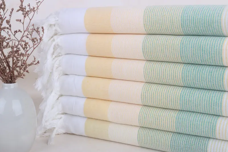 Custom Turkish Towel, Yellow-Green Striped, Beige, Organic Cotton, 40x67 Inches