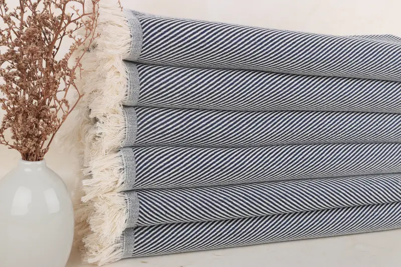 Turkish Beach Towel Navy Striped, Organic Cotton, Beige, 36x71 Inches