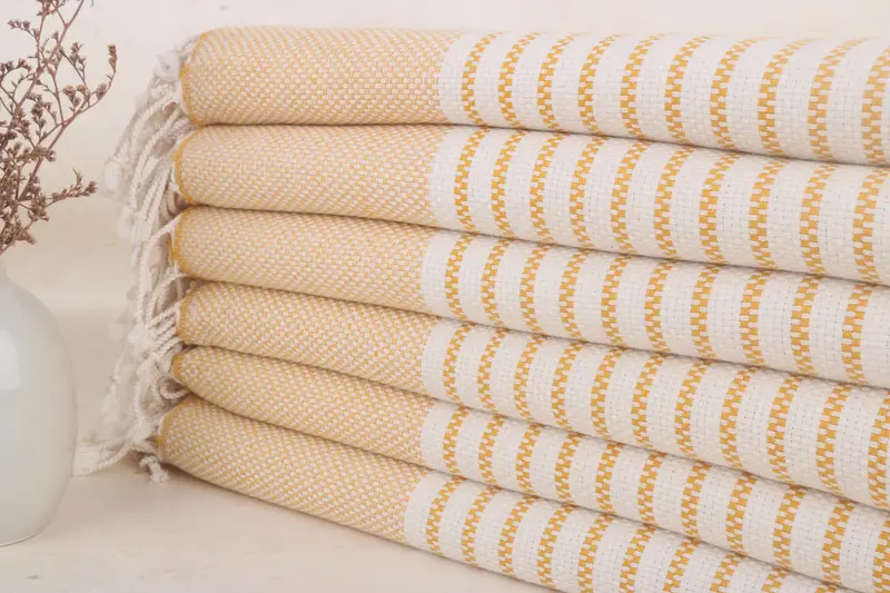 The towels are constructed from 100% organic Turkish cotton, ensuring superior absorbency and softness. They are woven on hand looms, resulting in dimensions of 75x40 inches or 190x100 centimeters, with a tolerance of up to 1-2.5 centimeters due to their handcrafted nature. Weighing 400 grams, these towels provide a lightweight and space-efficient solution.