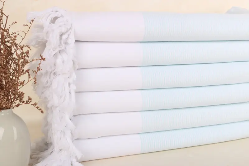These towels are woven from 100% organic Turkish cotton, ensuring superior absorbency and durability. Each towel measures 70x40 inches or 100x180 cm, with a tolerance of up to 1-2.5 cm due to hand-weaving. The weight of these towels is 290 grams, making them lightweight yet robust.