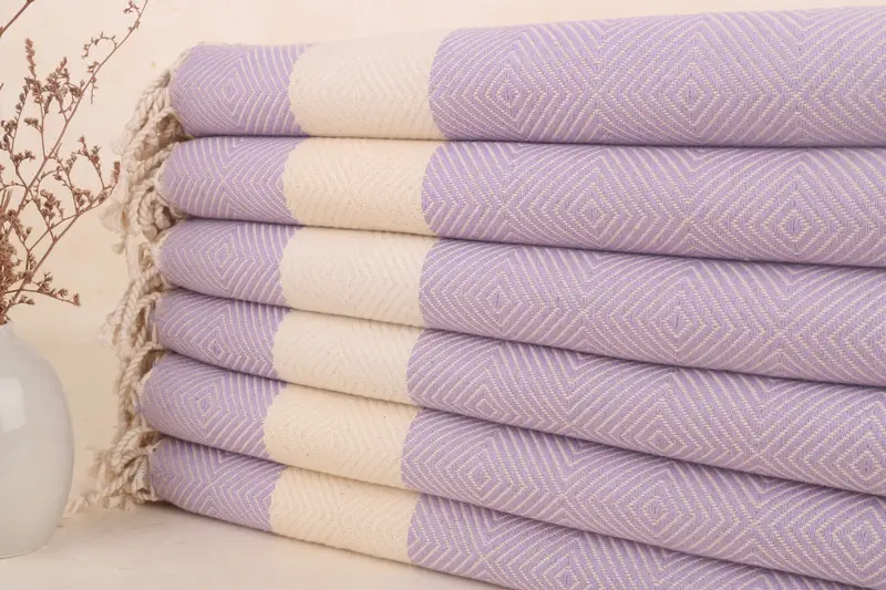 Characterized by 100% organic Turkish cotton, these beach towels exhibit exceptional absorbency and softness, ensuring an optimal guest experience. Resulting in towels weighing 520 grams and measuring 40x79 inches (100x200 cm), the hand-weaving process introduces a tolerance of up to 1-2.5 cm.