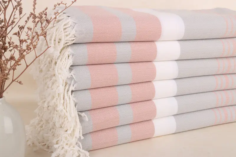 Turkish cotton serves as the foundation for these beach towels, ensuring they are absorbent and soft. They have a weight of 280 grams and a size of 40x71 inches or 100x180 centimeters, with manual weaving allowing for a tolerance of 1-2.5 cm. Crafted through traditional hand-loom techniques, these towels are designed to dry quickly and are ideal for multiple uses.