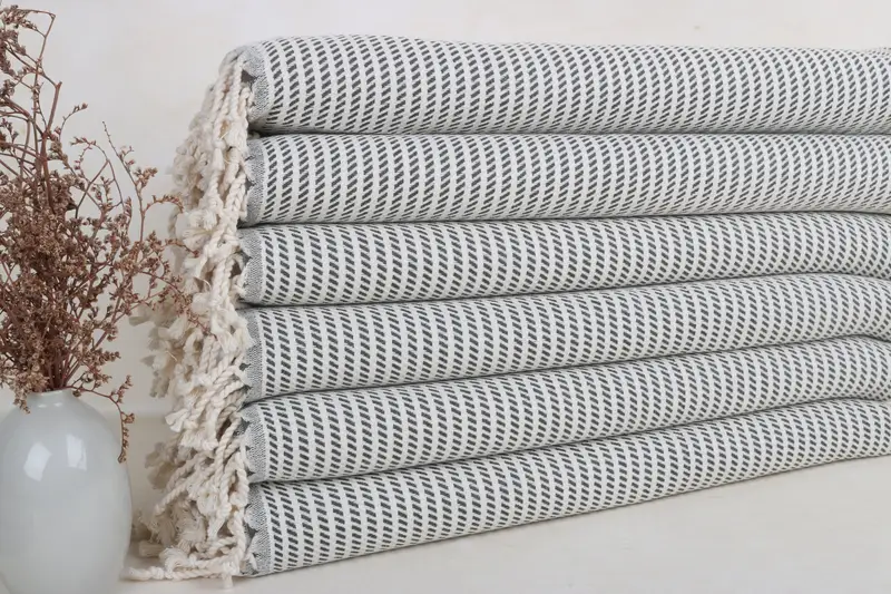 100% organic Turkish cotton characterizes these towels, ensuring high absorbency and breathability, resulting in quick drying and ease of use. Each towel measures 20x40 inches (50x100 cm) with a tolerance of up to 2.5 cm, weighing precisely 122 grams. Hand-woven on looms in an atelier, they maintain a soft texture and intricate design.