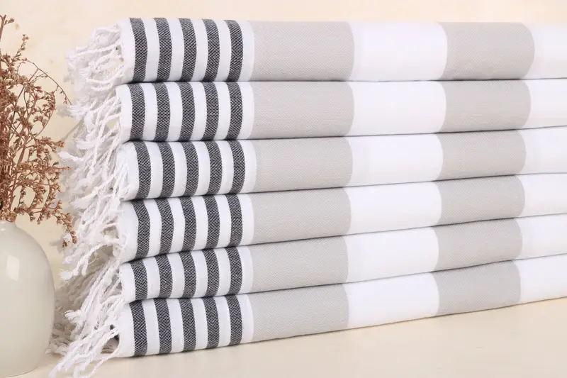 The beach towel is characterized by its 100% organic Turkish cotton composition, ensuring high absorbency and softness. Weighing 100 grams and sized at 24x40 inches or 60x100 cm, these towels exhibit a minor hand-weaving tolerance of 1-2.5 cm. Each piece allows for personalized embroidery options, enabling the addition of names, logos, dates, or initials in various colors and fonts.