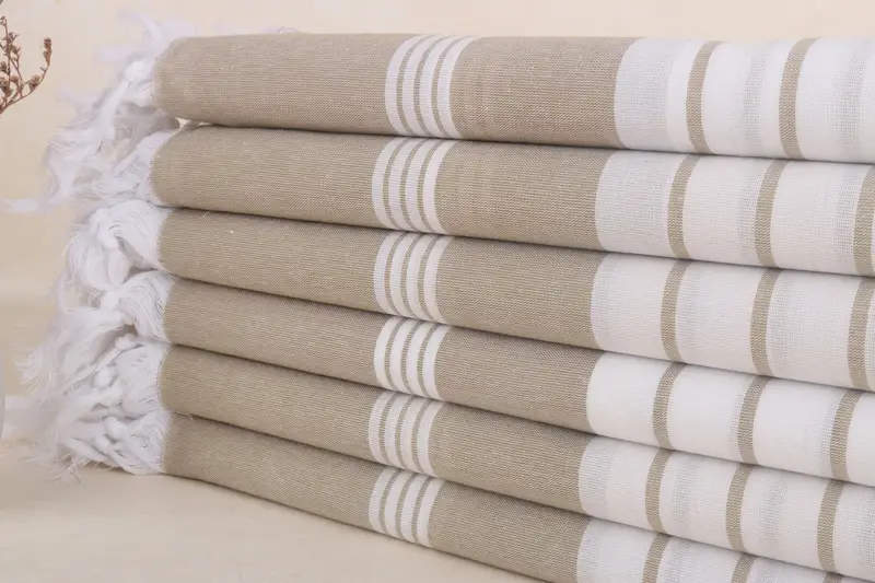This product comprises 100% organic Turkish cotton, ensuring optimal fiber composition and absorbency. Weighing 200 grams, the towel measures 67x36 inches (90x170 cm) with a tolerance of up to 2.5 cm due to its hand-woven nature. The towel's design allows for customization, including embroidery and pre-shrunken status for user convenience.