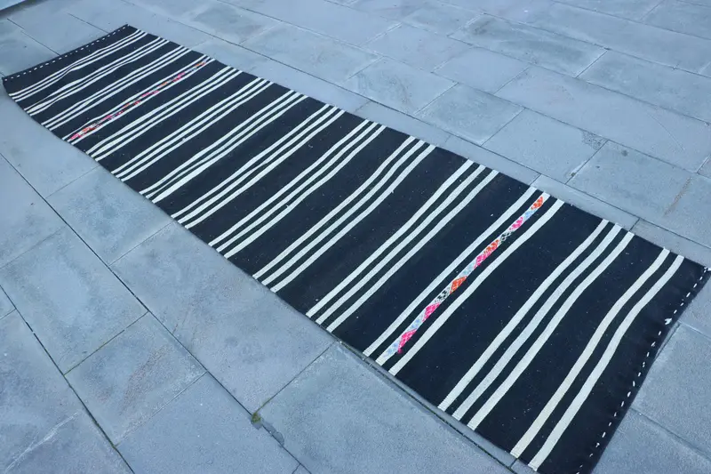 2.7x10.4 ft Rug, Turkish Vintage Rug, Kilim Black Solid Rug