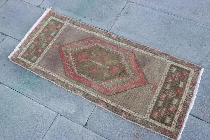 Turkish Vintage Rug, 1.5x3.7 ft Rug, Red Small Bordered Rug