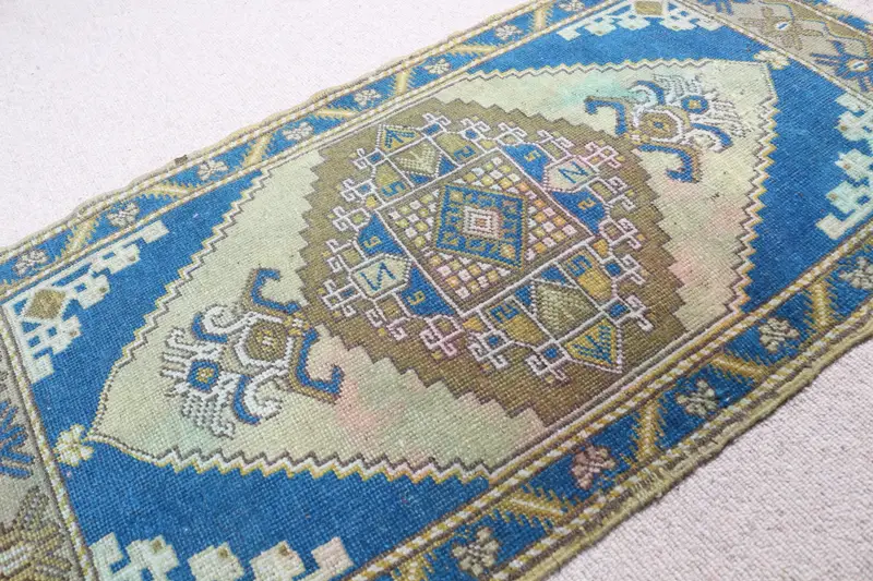 Vintage Rug, 1.9x3.6 ft Small Turkish Rug, Blue Yellow Persian Rug