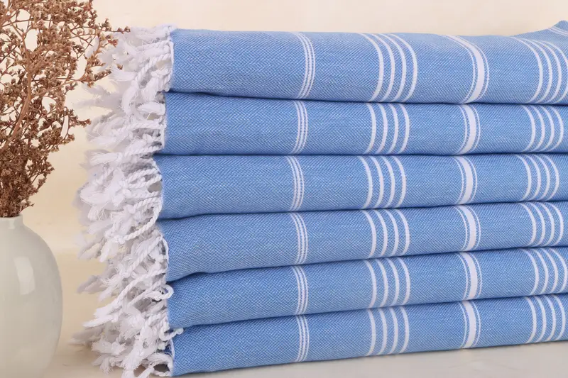 Beach Towel Embroidered Turkish Cotton Blue Stripes, 40x71 Inches
