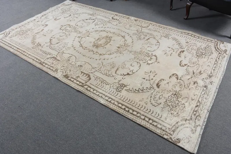 Turkish Rug 4.9x8.9 ft, White Brown Solid Wool Vintage Rug
