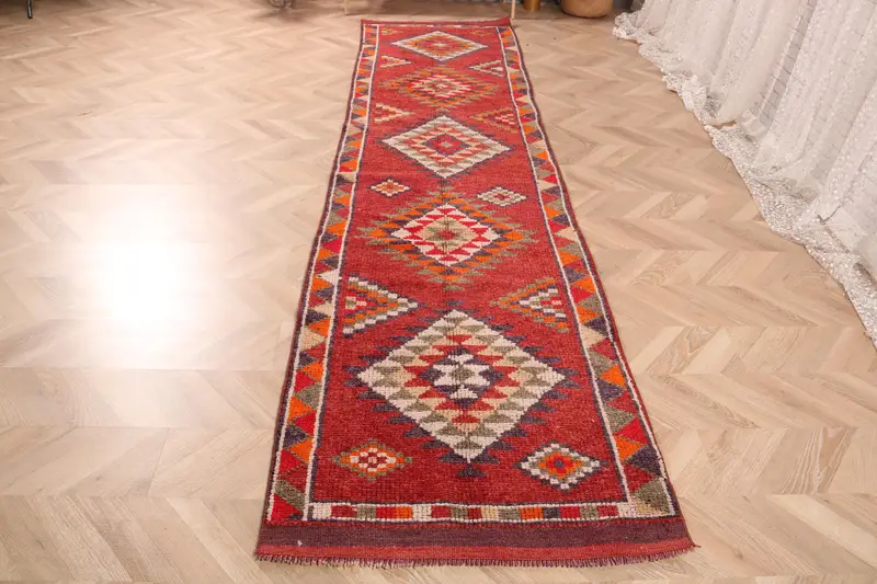 2.8x11.7 ft Vintage Rug, Turkish Runner Rug, Red Orange Animal Print Rug