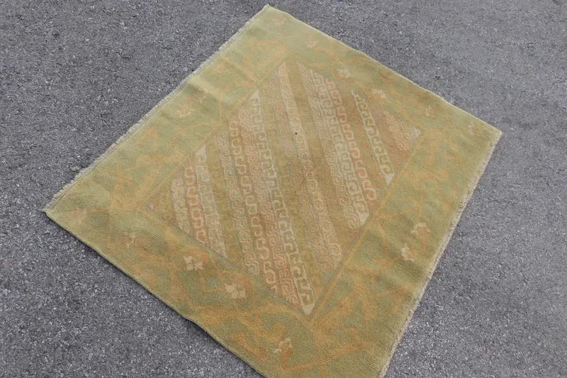 Turkish Vintage Small Rug 3.8x3.2 ft, Green Brown Floral Rug