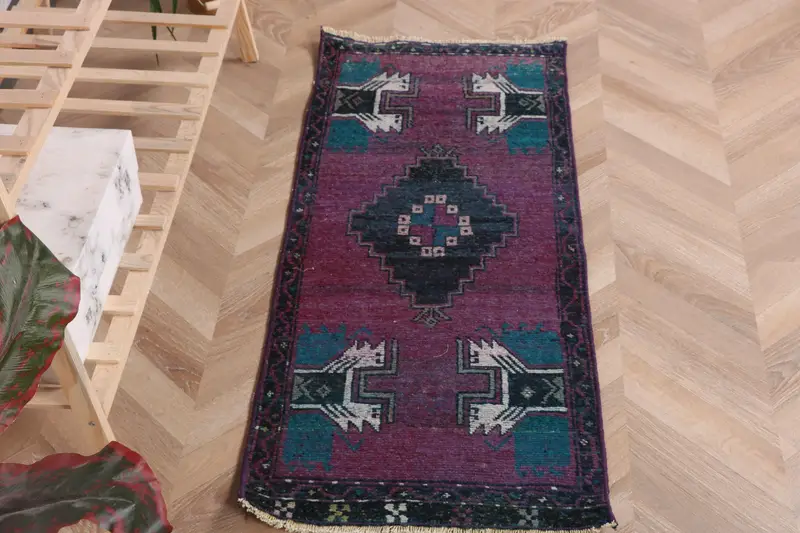 Vintage Turkish Rug 1.5x3.6 ft, Purple Small Floral Wool Rug
