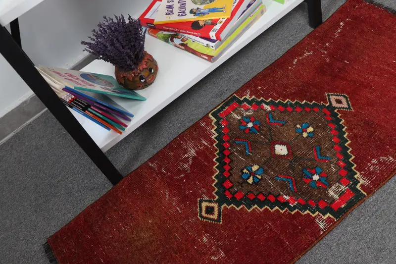 Turkish Small Rug 1.4x3.37 ft, Red Blue Persian Rug Wool