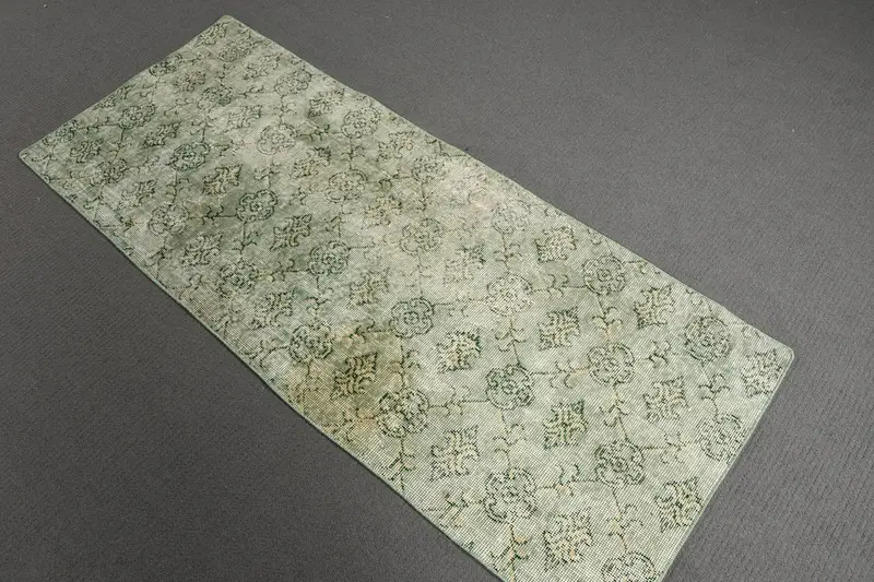 Turkish Small Rug, 2.3x5.6 ft Vintage Rug, Green Floral Wool Rug