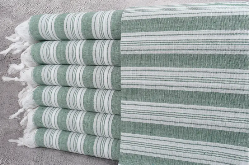 Turkish cotton is utilized for these towels, ensuring durability and superior absorbency. The organic towels feature a fiber composition characterized by premium Turkish cotton, enhancing their usability across diverse settings. Each piece measures 38x67 inches or 95x170 centimeters with a tolerance of up to 2" or 5cm due to hand-weaving techniques.
