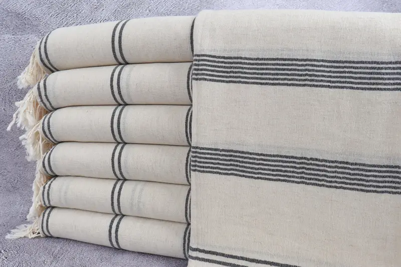 Turkish towels are characterized by their flat-woven construction, ensuring minimal space occupation. Composed of premium organic Turkish cotton, these towels are engineered for superior absorbency, resulting in softer texture with each wash. Measuring 36x79 inches or 90x200 centimeters with a 290 grams weight, each towel allows for a hand-weaving tolerance of 2" or 5 centimeters.